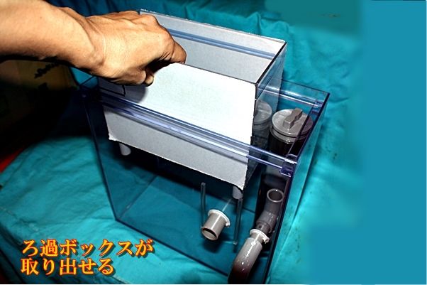 ろ過槽内部の ろ過ボックスが 取り出せる。 だから 濾材の洗浄が 超簡単に 便利になった。