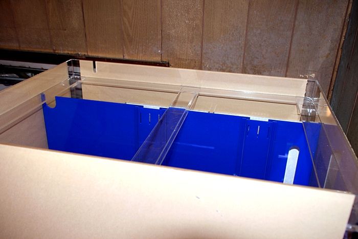 青い仕切り板の 裏に 濾過槽が収納されている。↑