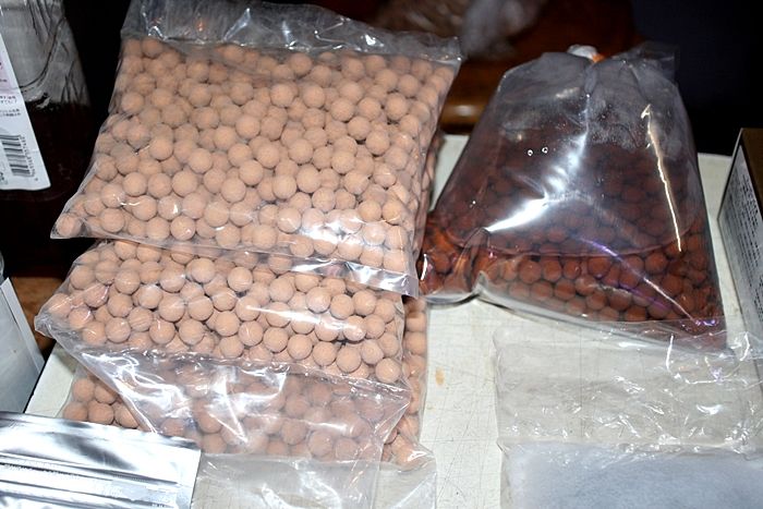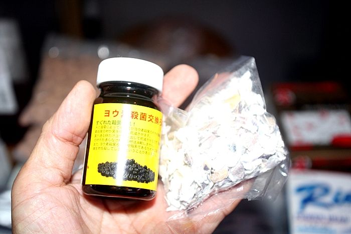 もう一つ 反対側のキャップの中に入れるものが、 ヨウ素殺菌ボール(殺菌のため)と カキガラ(PH低下防止のため)