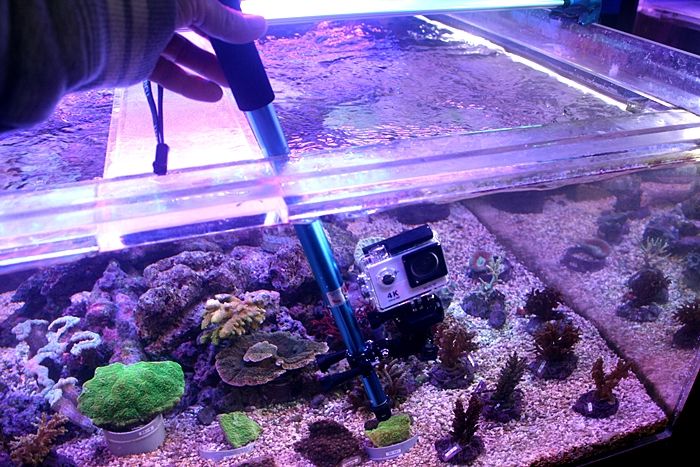 これで 水槽表面の 汚れと 関係なく動画を撮影できるし、カメラを 水槽内で移動させることによって 被写体を多角的に撮ることも可能だ。