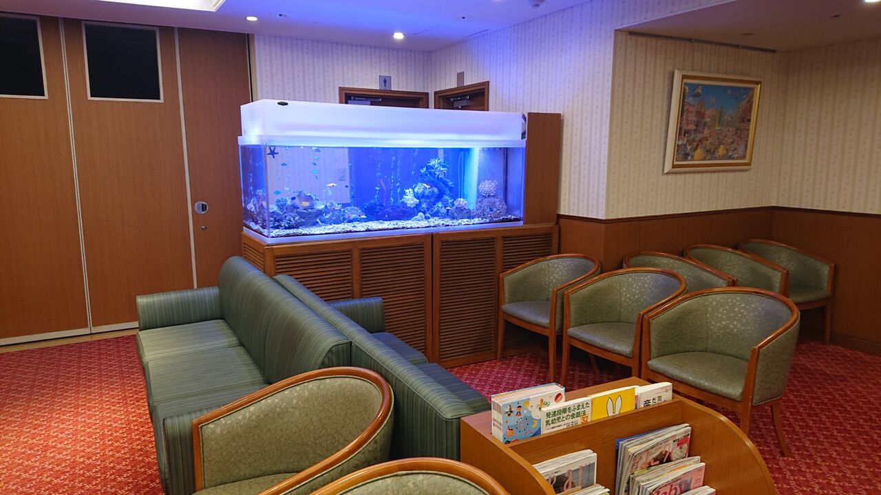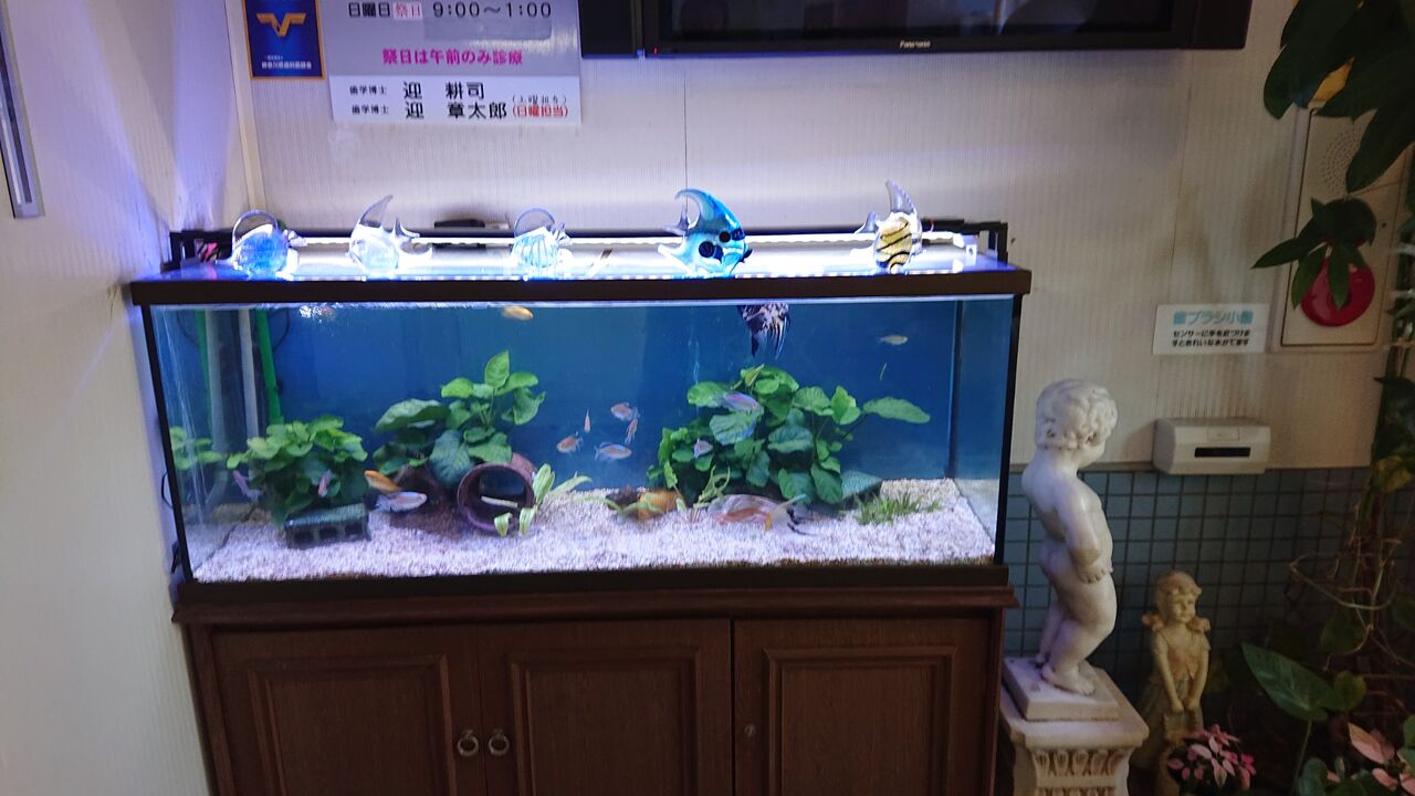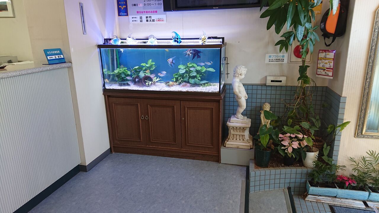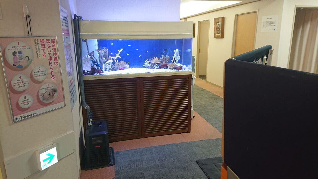 これは赤坂の、総合病院の受付にある150 cm水槽だよ。20年以上リースでお世辞になっているんだよ?院長先生のリクエストで、 タテジマキンチヤクダイが主役の水槽なんだよ。