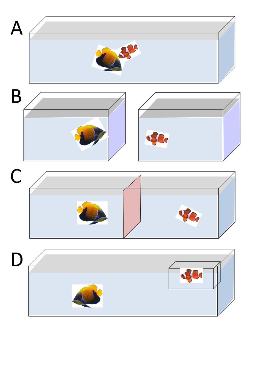 D のように分けた場合、 水質は同じであるが・・・・・・・・ 隔離されている魚はいつまでたっても、自分の場所に縄張りを作る事ができない。