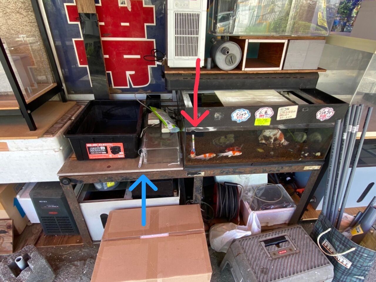 外の水槽の水温計(赤い矢印)は