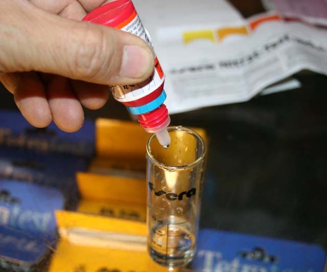 リン酸は 測った水が透明に近いほど、良い。青くなるほど悪い。