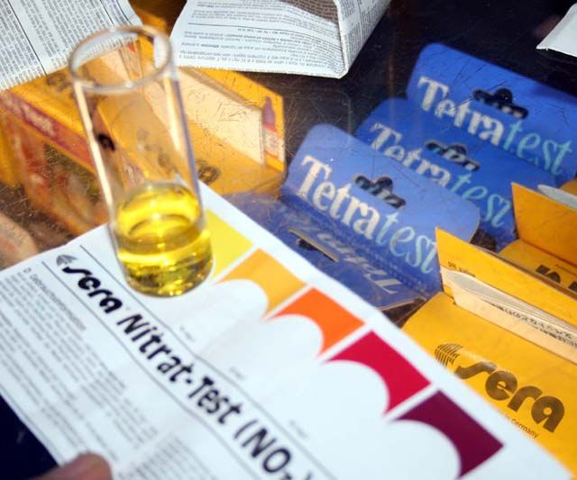 飼育水が左の黄色になれば硝酸塩ゼロ。右の赤色になればなるほど、硝酸塩の数値がわるい。