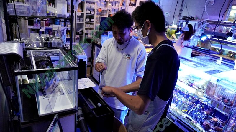 午後からご来店です。まず水質チェック。アンモニア・亜硝酸・硝酸塩。