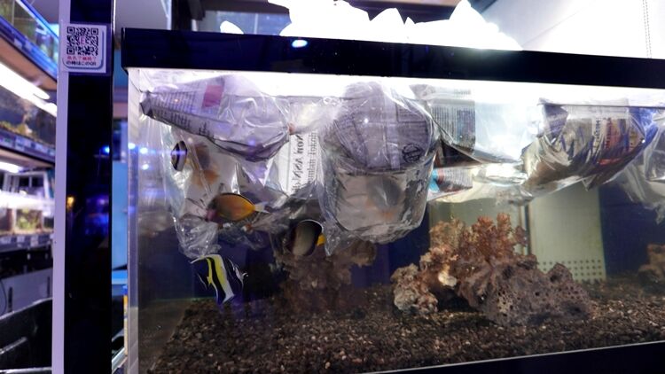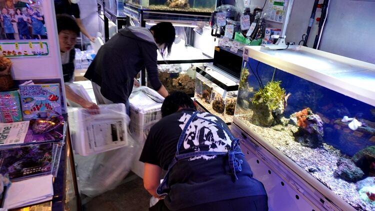 お魚だけを 水槽に入れていく。 つまり 袋の中の水は 水槽に入れない。