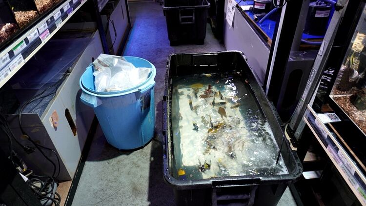 袋に入ったお魚を 1匹 1匹確認し これから泳がせる 各水槽に 浮かせていく。