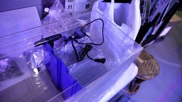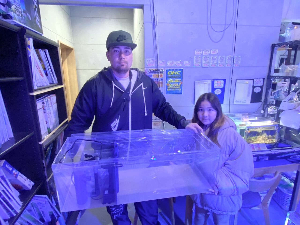 と かんたん槽NK-90を 軽く手に取る この お客様。これが 2台目水槽。