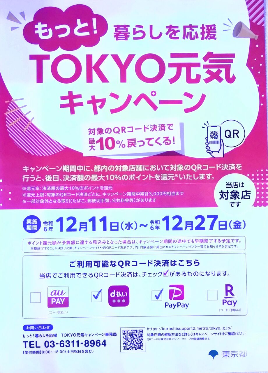 でっ!今度は東京都がQR決済でお買い物していただくと10%ポイント還元してくれるキャンペーンが日海センターでも本日から始まります!!!!