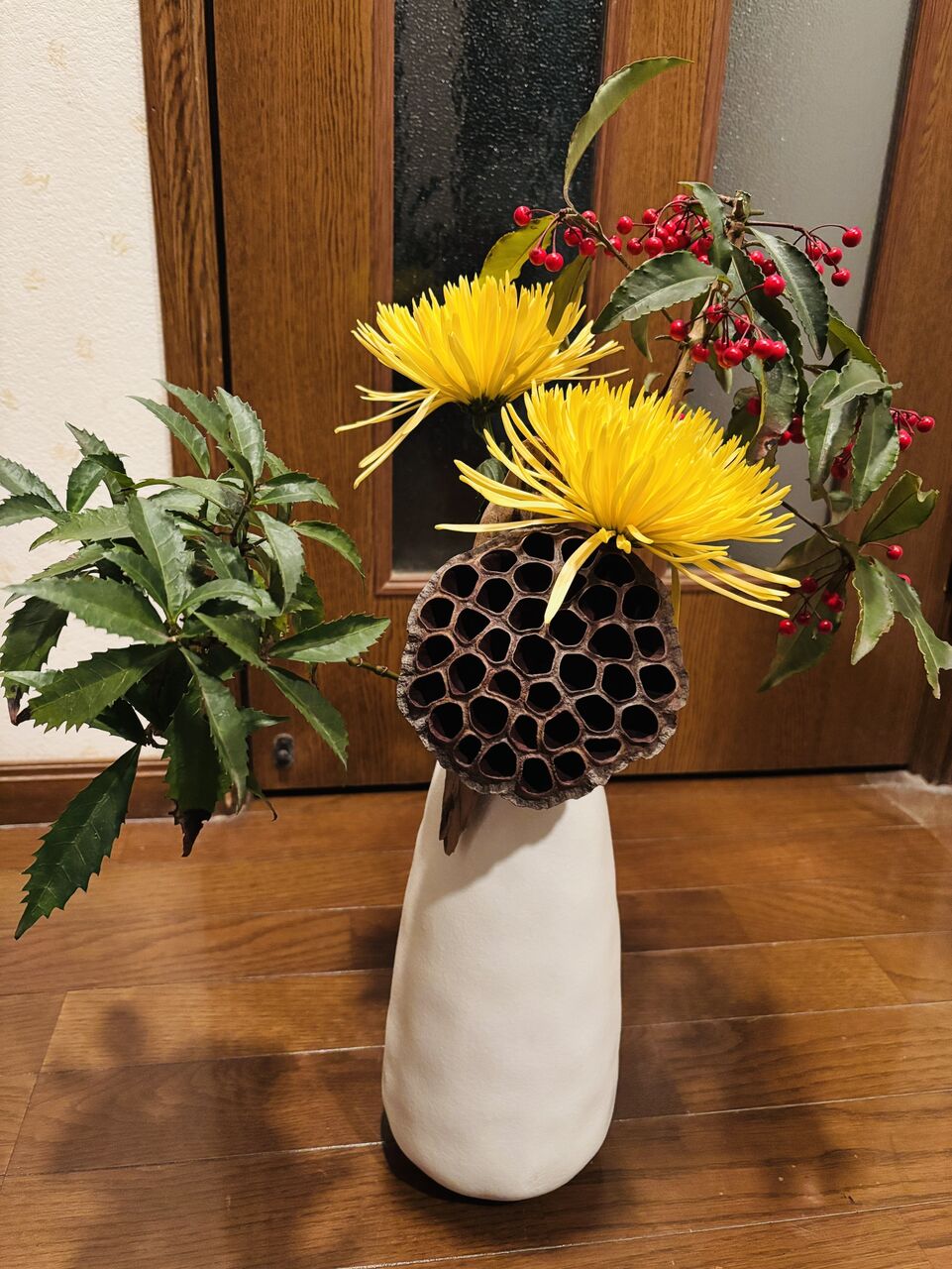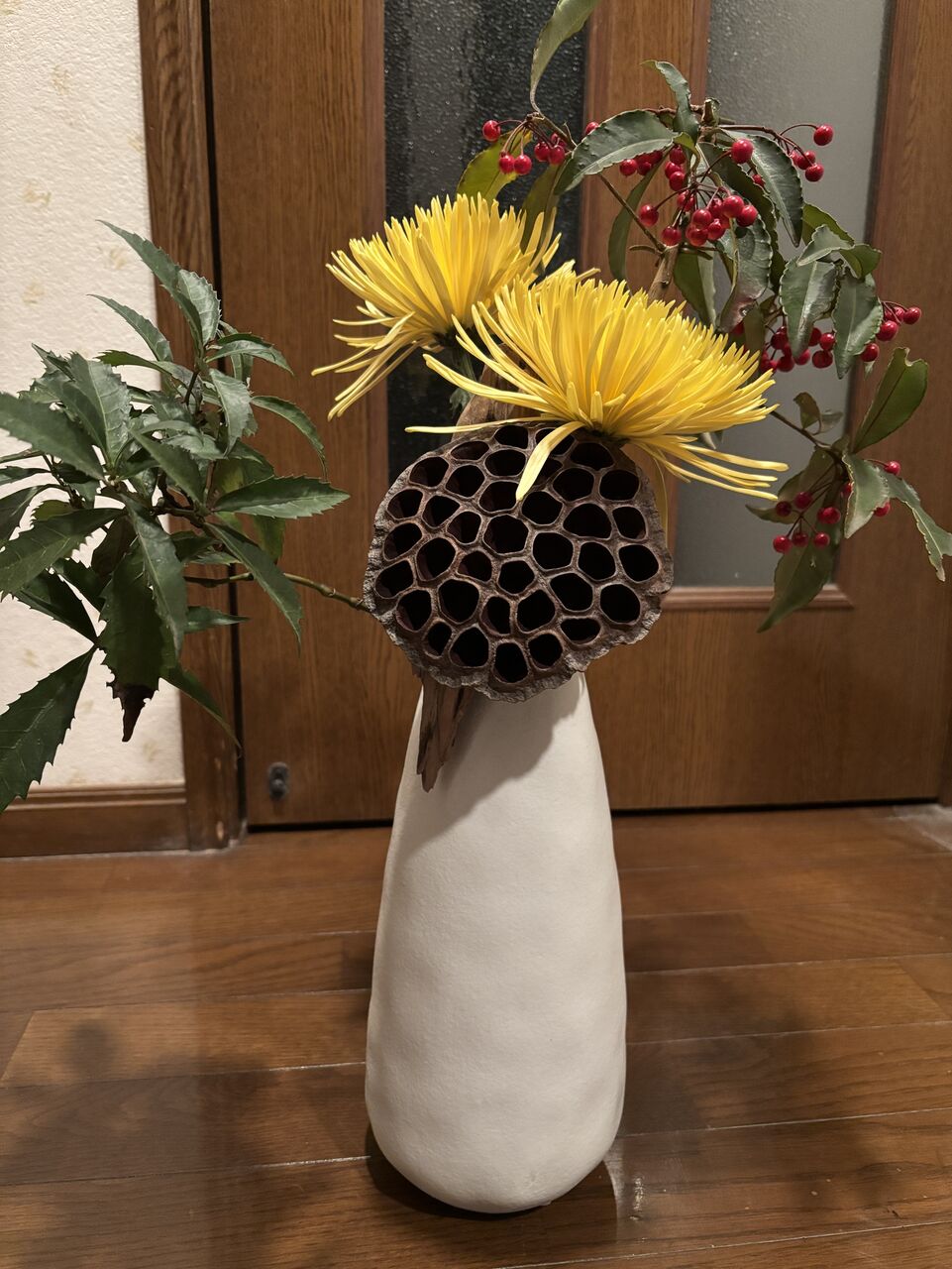 大輪菊と枯れた蓮子の殻を生ける。
